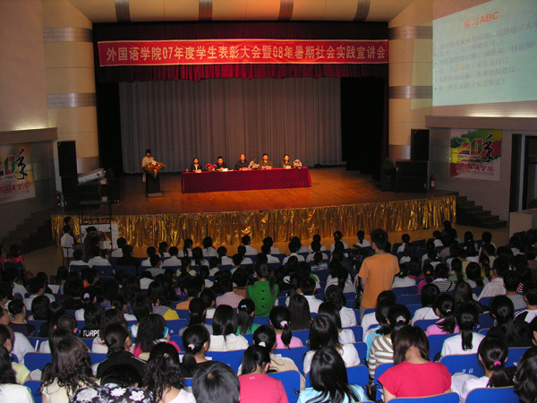 5月27日中午,外国语学院07年度学生表彰大会暨08年暑期社会实践宣讲会在艺术中心礼堂举行。会议由外国语学院党总支副书记隋丽丽主持,外院党政负责人出席会议,1—3年级近千名学生参加了大会。