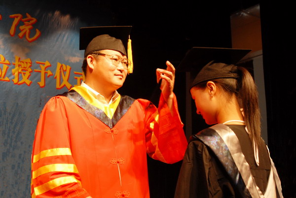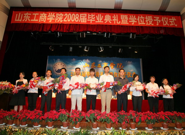杜文华副书记首先宣读了2008年省级优秀毕业生名单及“西部计划”志愿者名单。随后,在雄壮的乐曲声中,出席典礼的校领导分别为山东省优秀毕业生代表和“西部计划”志愿者颁奖。随后,3000余名获得学士学位的同学身穿学位服在欢快、激昂的音乐声中神采奕奕地走上主席台,校领导为每一名学生正冠拨苏,授予学位,并同他们合影留念,现场气氛隆重、热烈、振奋人心。