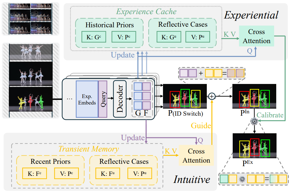 该论文为应对稳定且有效的多目标跟踪测试时校准面临的巨大挑战,提出了一种基于经验与直觉的测试时校准框架(Test-time Calibration from Experience and Intuition, TCEI),用于在训练与测试数据存在分布偏移时提升模型推理的可靠性与鲁棒性。论文联合利用由近期观测目标构建的瞬时记忆,以及由先前处理过的长期测试视频累积的历史经验,为多目标跟踪中的身份关联提供自适应指导,有效缓解测试数据中外观变化、运动异常等分布偏移因素带来的性能退化。实验结果表明,所提出方法取得了更优的跟踪性能,并展现出良好的泛化能力。