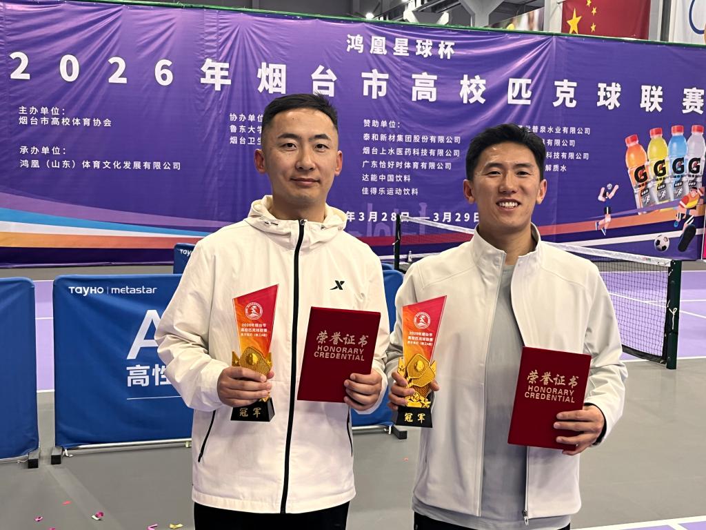 3月30日,由烟台市高校体育协会主办的2026年烟台市高校匹克球联赛在鸿凰星球社区圆满落幕。本次赛事历时2天,吸引了全市18所高校200余名师生参赛,48支团体队伍、150余名单项选手同场竞技。学校体育教学部选派4名教师参赛。经过激烈比拼,白振涛获教工A组男子单打冠军;白振涛、郭赛女获教工A组男子双打冠军;沈敬尧、李雨霏获教工A组女子双打第四名。