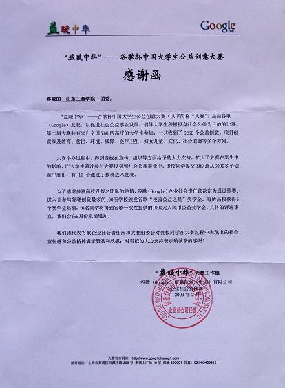 谷歌企业社会责任部和大赛组委会在感谢函中对我校学子在大赛过程中表现出的社会责任感和公益精神表示赞赏和欣慰,对我校给予的大力支持表示最诚挚的感谢。(作者:李彦栋编辑:李红)