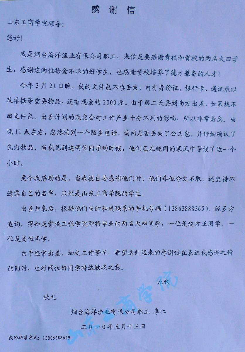 5月17日,我校接到一封来自烟台海洋渔业有限公司的感谢信,从而引出了一件感人事迹——