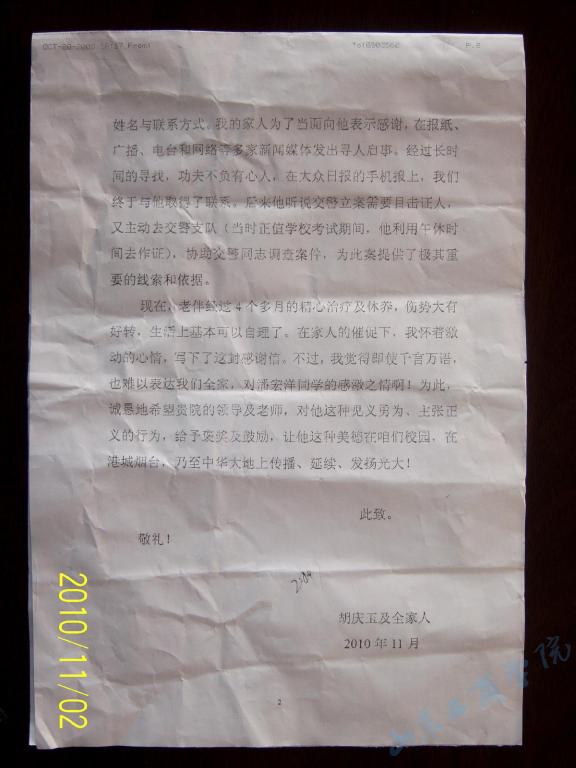 如今,杨靖华老人经过四个月的治疗已经康复出院,生活基本可以自理,老人的家属怀着激动地心情发来感谢信,对潘宏洋同学的事迹表示感谢。