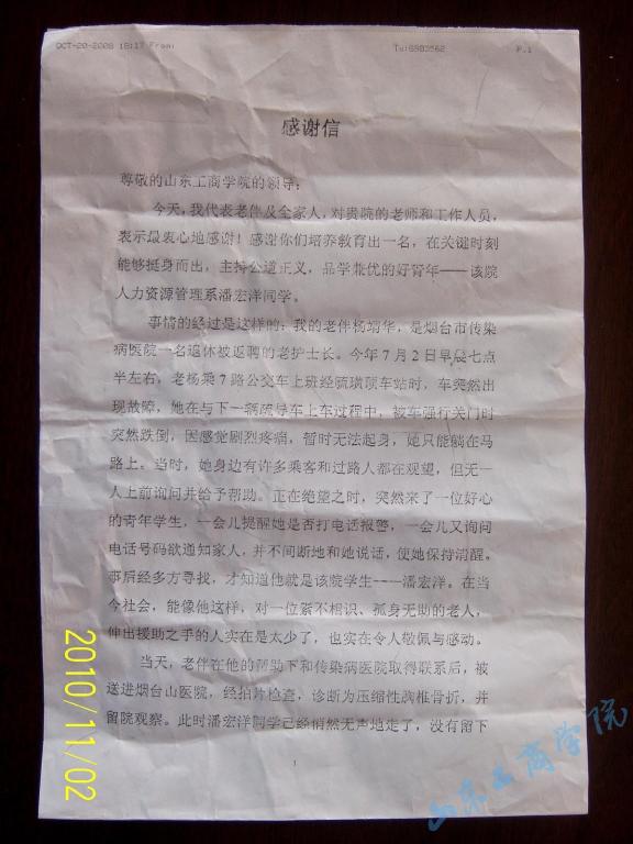 面对躺在马路上的陌生老人,是否有人愿意伸出援助之手?面对传说中的“碰瓷”有几个人会见义勇为?近日,校学生处收到的一位老人寄来的感谢信,真实的讲述了我校人力资源管理082班潘宏洋同学如何助人、救人又不留姓名的事迹。