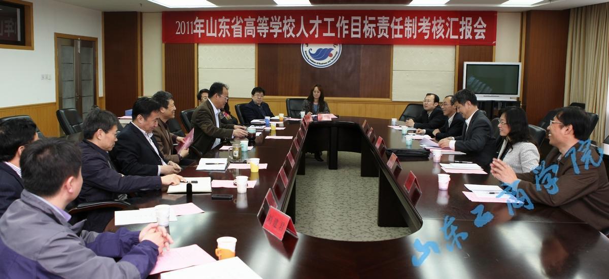 4月25日上午,由青岛大学副校长汪黎明为组长的省教育厅人才工作目标责任制考核检查组一行5人来到我校进行2011年度人才工作目标责任制考核。党委书记魏金陵主持汇报会并致欢迎辞,院长刘全顺汇报了学校人才工作情况,学校办公室、组织部、宣传部、人事处、教务处、科研处、学科办、财务处等部门负责人参加了汇报会。