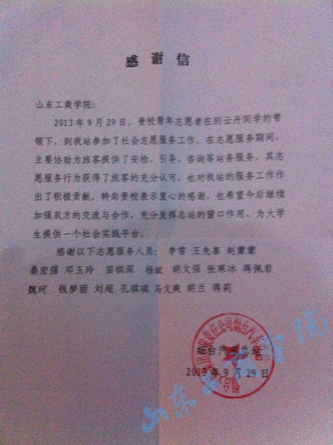 近日,烟台汽车总站向我校发来感谢信,对我校青年志愿者服务中心志愿者十一期间志愿服务烟台汽车总站的优秀表现给予了高度评价并表示感谢。