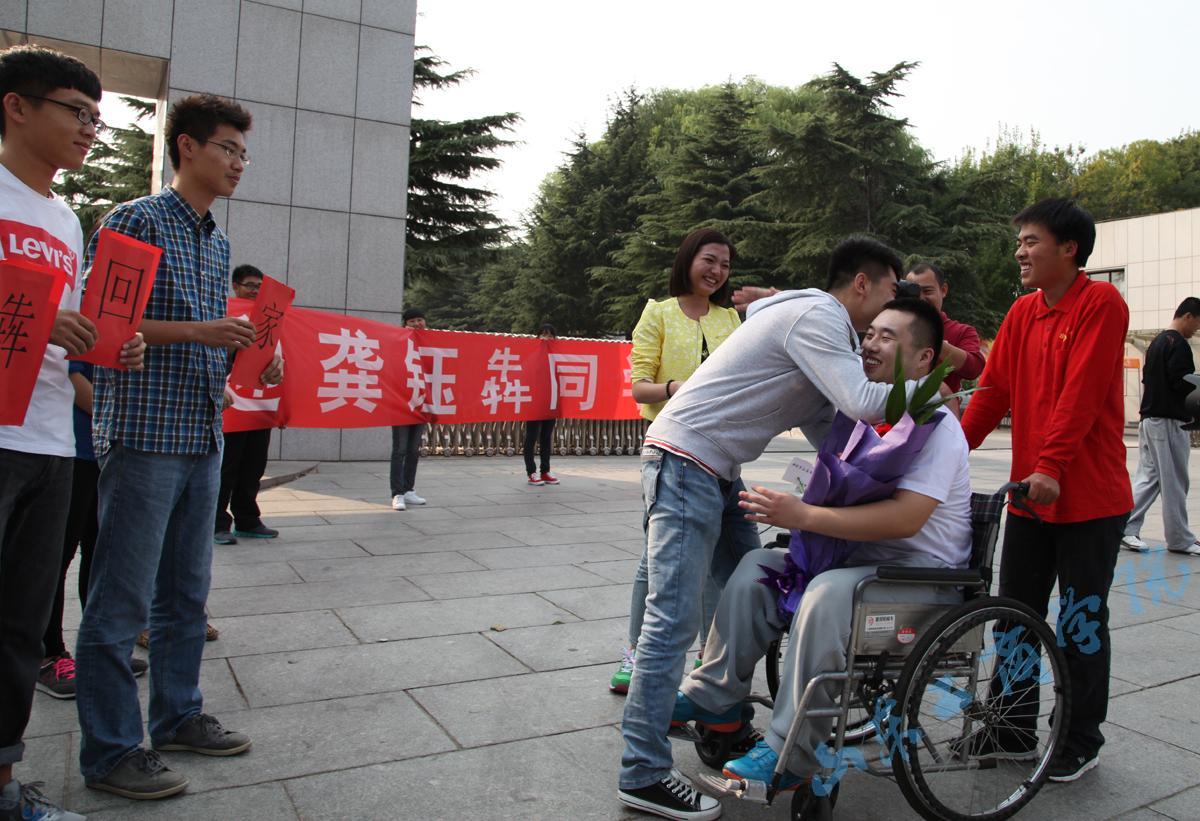 龚钰犇在带给我们感动的同时,也带给我们更多前行的动力。学校得知他正式要报到学习后,宣传部、学生处、团委、后勤管理处、保卫处、中加学院等有关部门做了大量细致周到的工作,大到为他免除全部学杂费、为他父母临时安排工作,小到在他去教室的路上地砖平不平稳的检查,校团委和中加学院的志愿者协会还为他成立了由50多名同学组织的帮扶服务队。