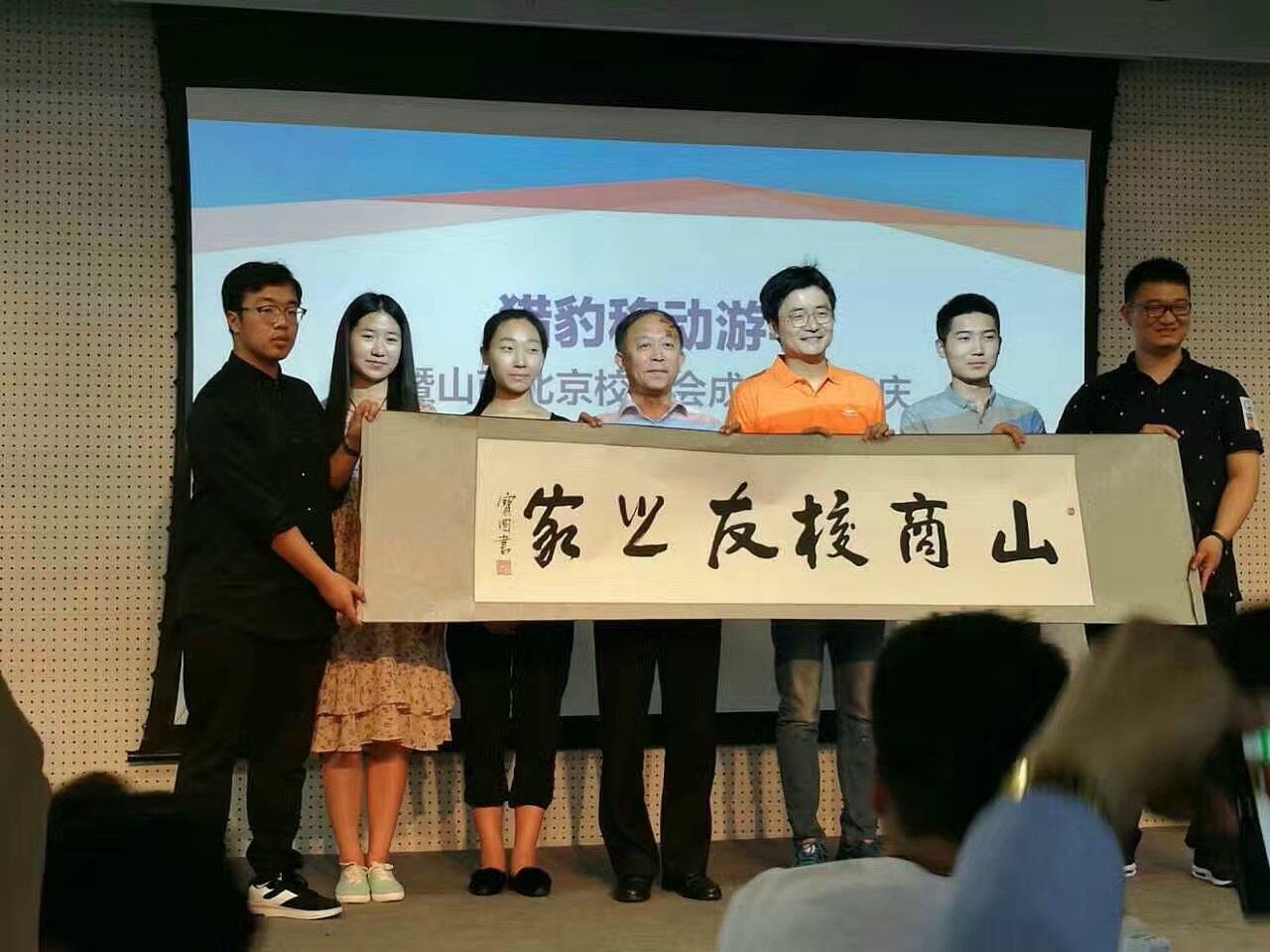 郭金创代表学校向北京校友会赠送了“山商校友之家”的题字,并与校友代表合影留念。