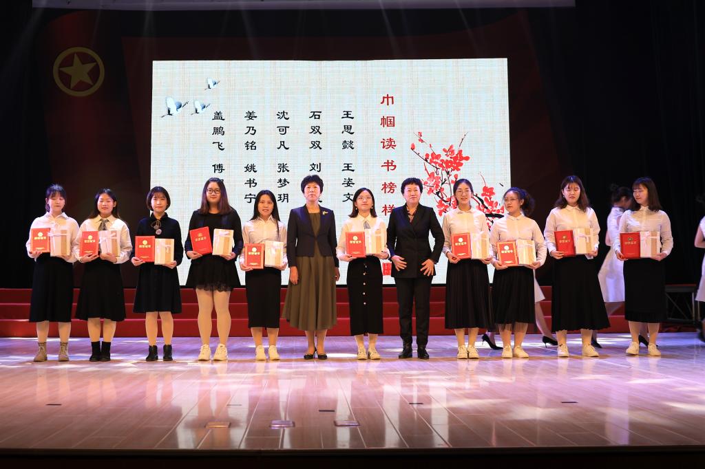 活动现场,王秀梅,黄金凤(管理91级校友),市体育局教练高飞、王倩丽,学生家长姜忠林、丛言栗和获奖教师朱敏、王俊梅、姜爱英逐一做了分享,畅谈读书心得,分享读书感悟。被表彰的10名女大学生献上了诗朗诵《读中国》,教师合唱团和人文与传播学院的大学生表演了快闪《我和我的祖国》。