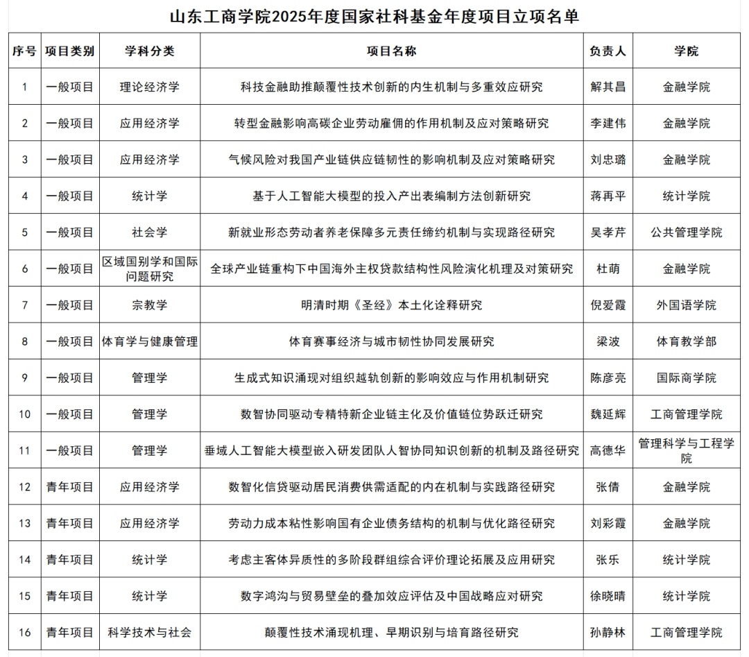 近日,全国哲学社会科学工作办公室公布了2025年国家社科基金年度项目立项名单。学校共获批年度项目16项,立项数连续两年位列全国学院类大学第1位,省属高校第6位。其中,一般项目立项11项,立项数连续4年位列全国高校前100名。立项项目涉及9个学科,其中应用经济学4项、管理学3项、统计学3项、理论经济学、社会学、区域国别学和国际问题研究、宗教学、体育学与健康管理、科学技术与社会各1项,呈现出“主流学科引领、新兴交叉并进”的多元分布格局。