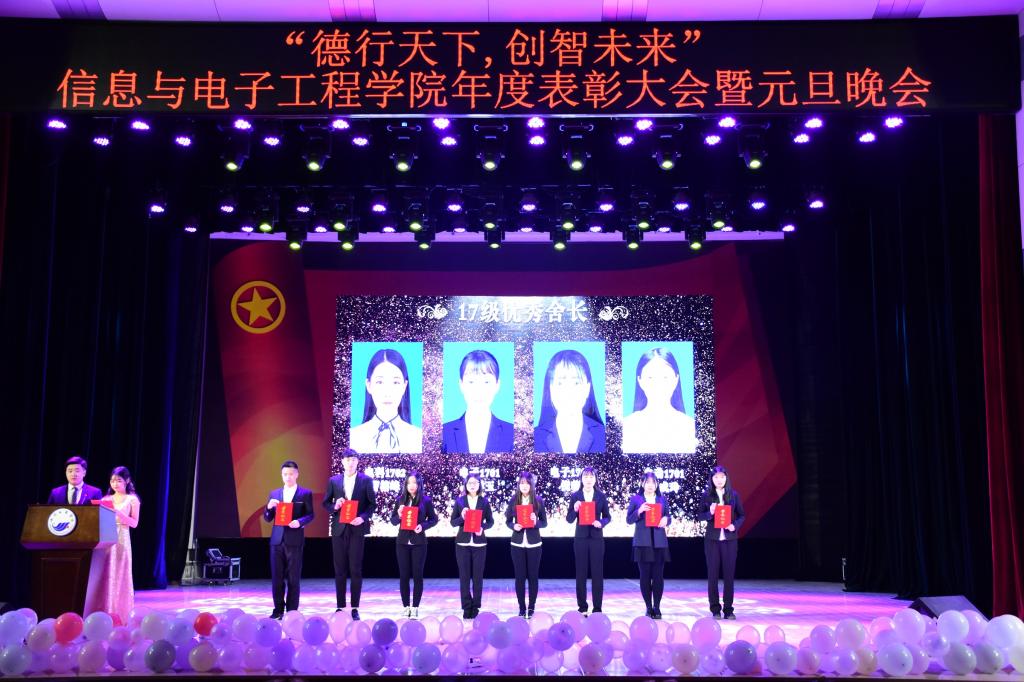 12月29日晚,信息与电子工程学院在大学生活动中心举办“德行天下创智未来”2018年度总结表彰大会。大会分为三个环节:表彰、考前动员和晚会。